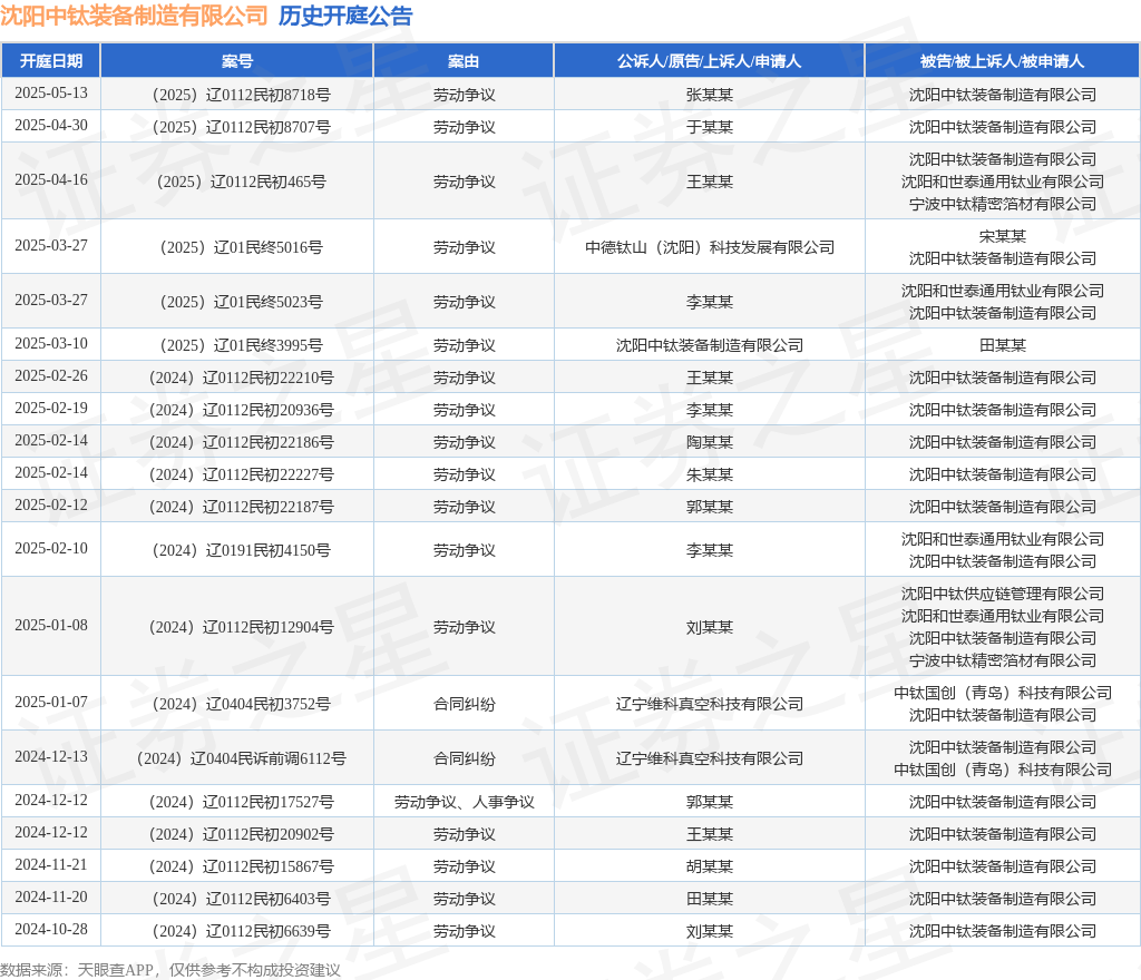 沈阳中钛装备制造有限公司作为被告/被上诉人的1起涉及劳动争议的诉讼将于2025年5月13日开庭